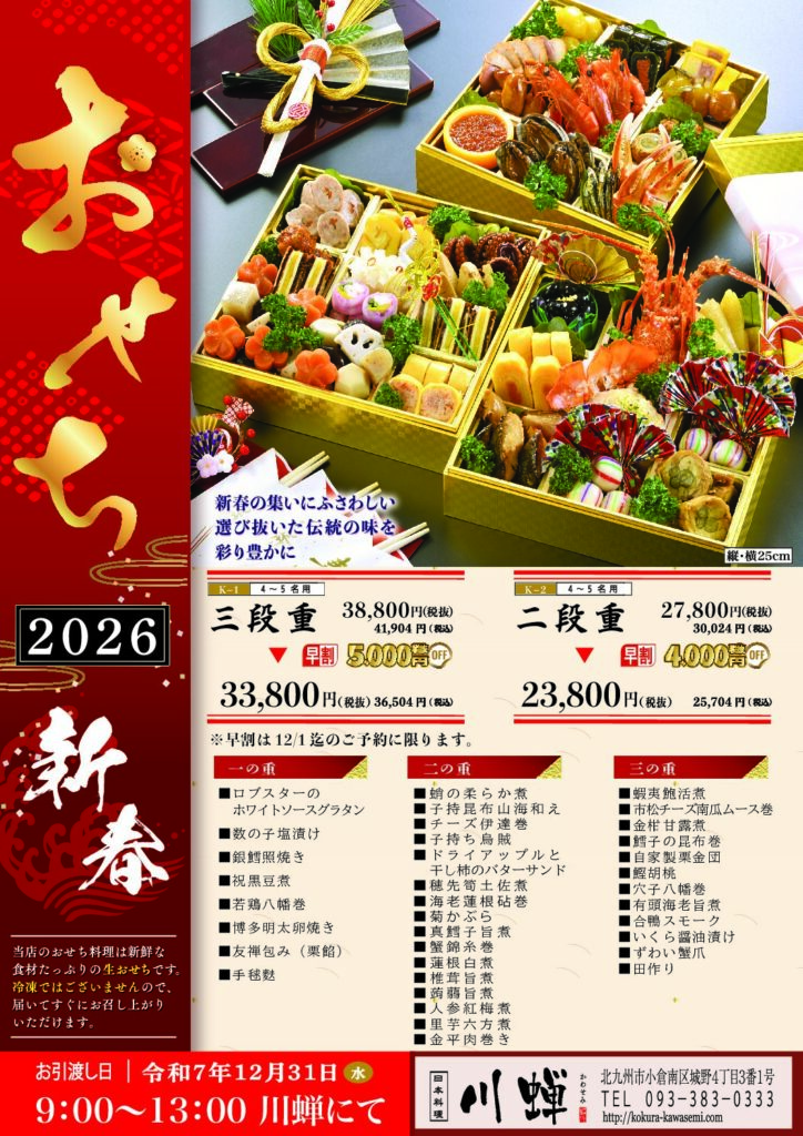 お知らせ お知らせ 2025.11.07 おせち料理 Warning: Undefined array key "file" in /home/r7607134/public_html/kokura-kawasemi.com/wp/wp-includes/media.php on line 1686 平素より日本料理川蝉をご利用いただき誠にありがとうございます。 新年を迎える慶びを華やかに彩るおせち料理「福招き」の予約販売を開始しております。 12/15までのお申込みとなっております。 皆様からのご予約待ちしております。